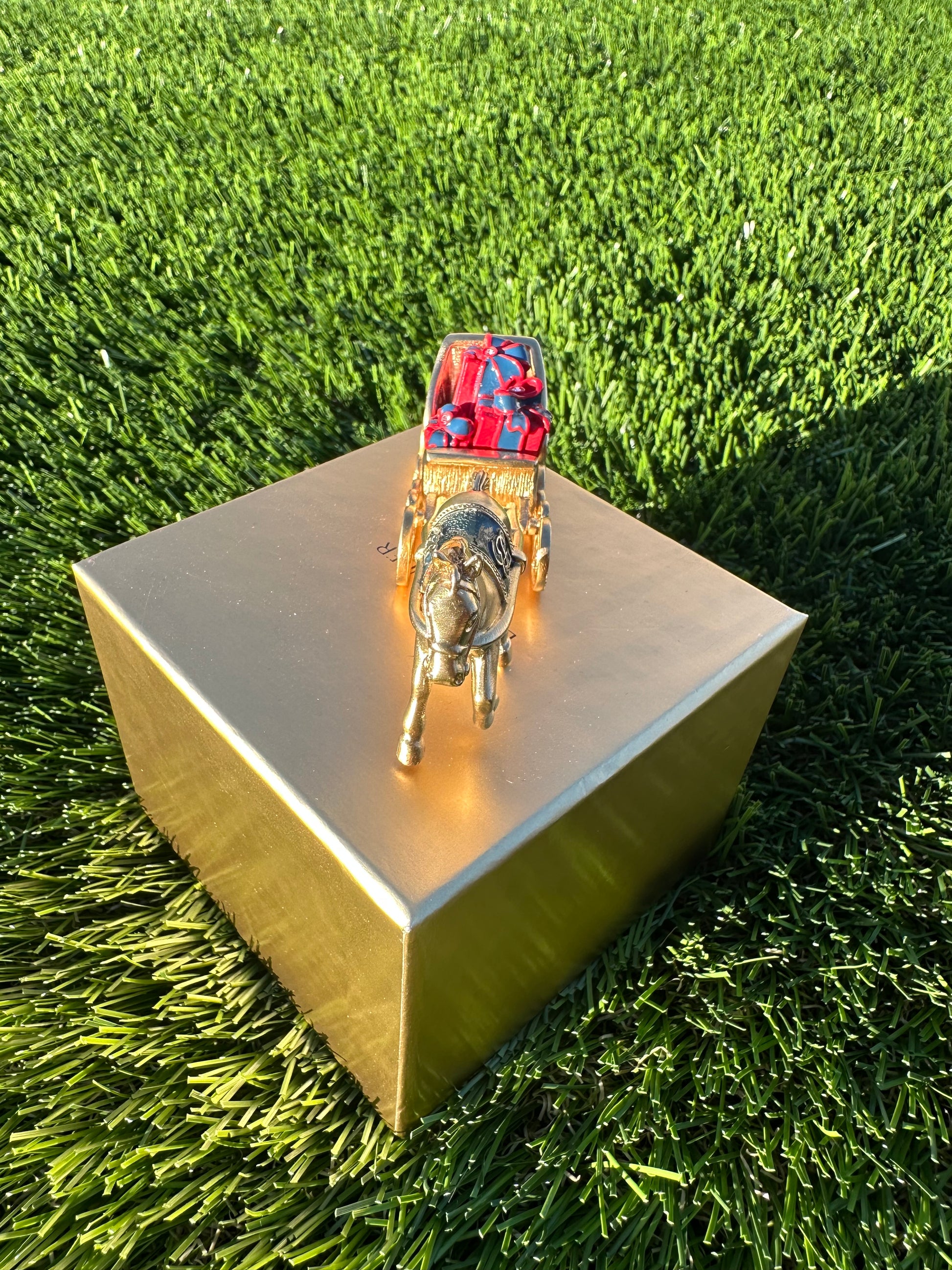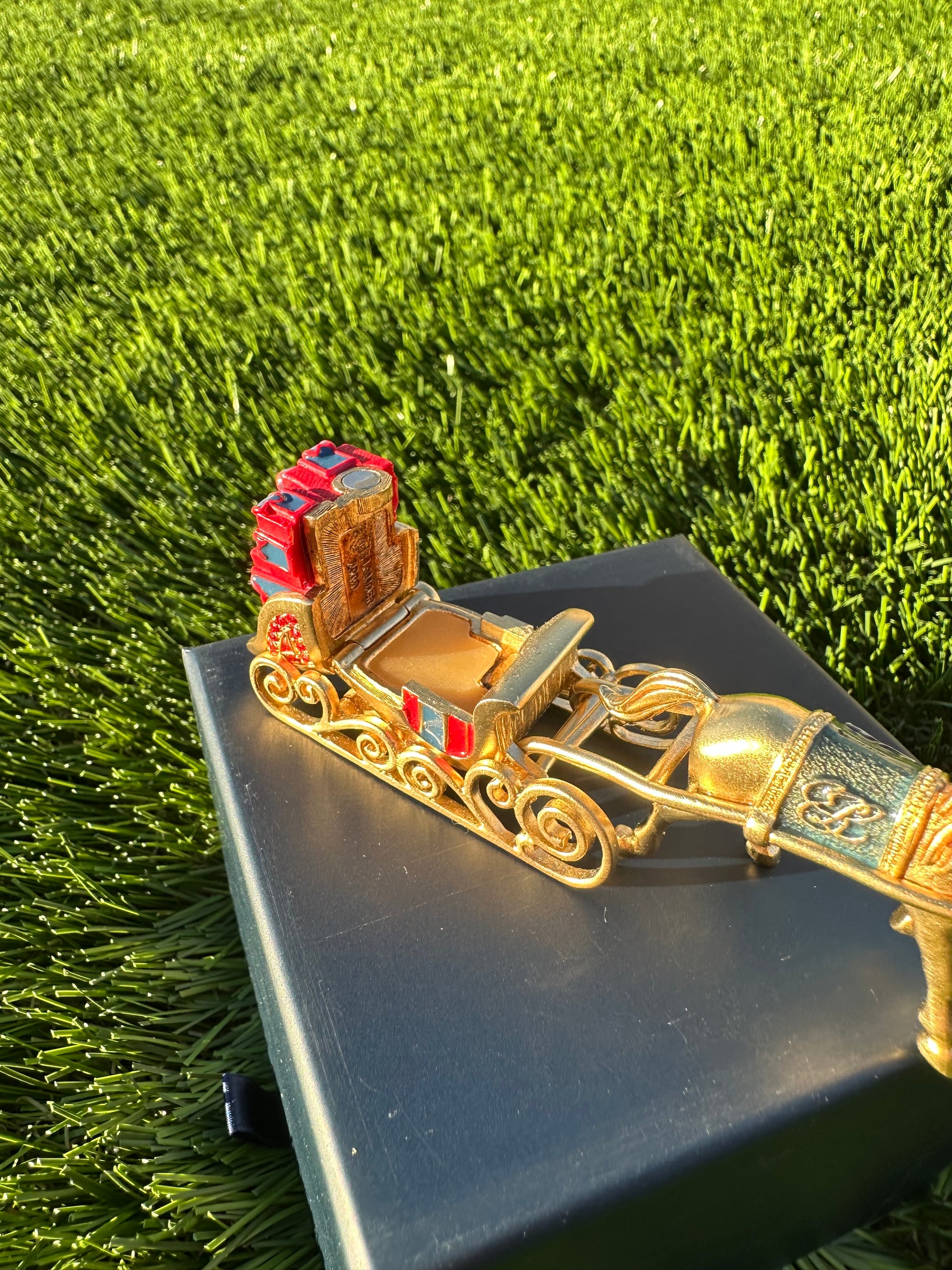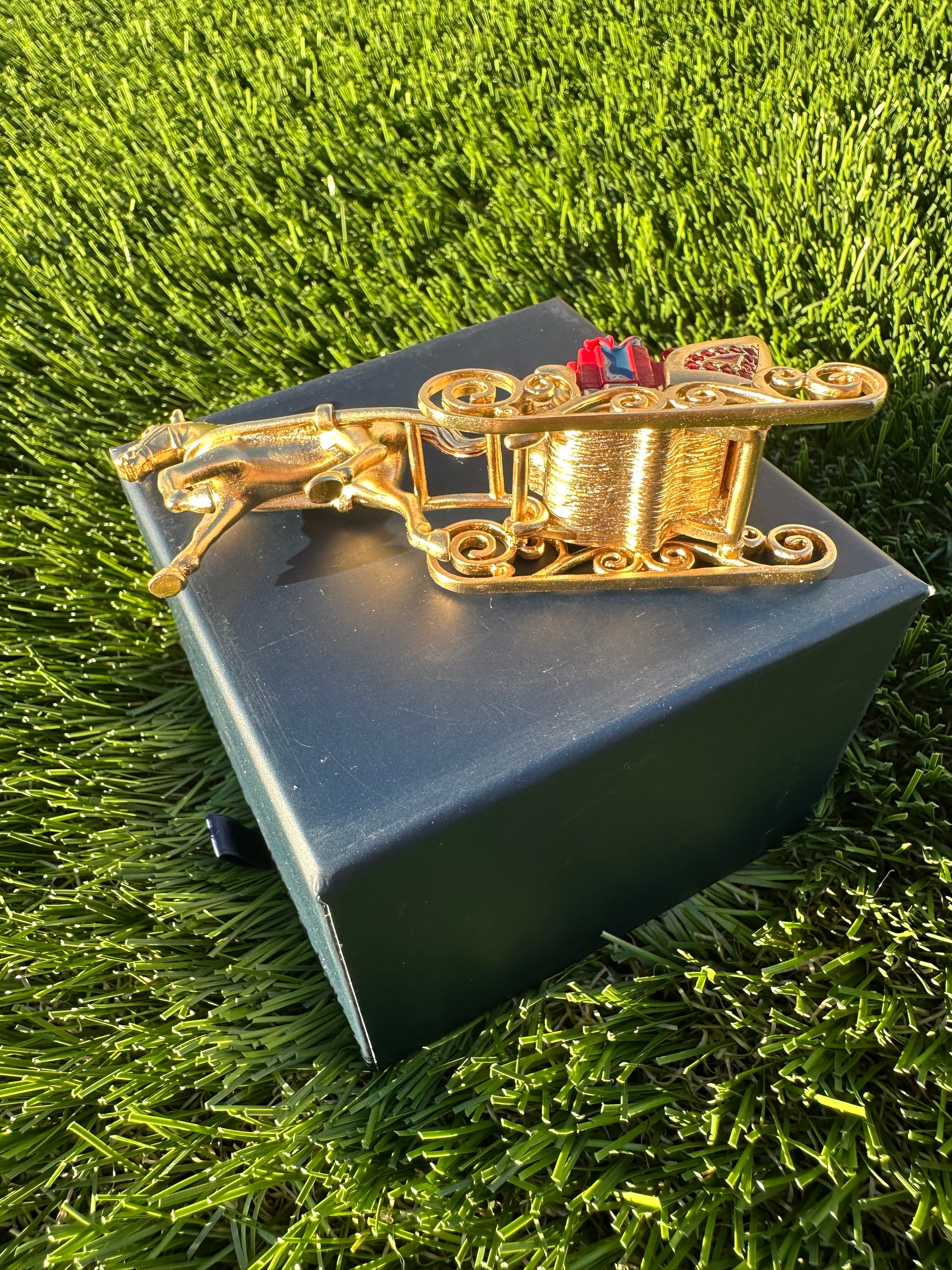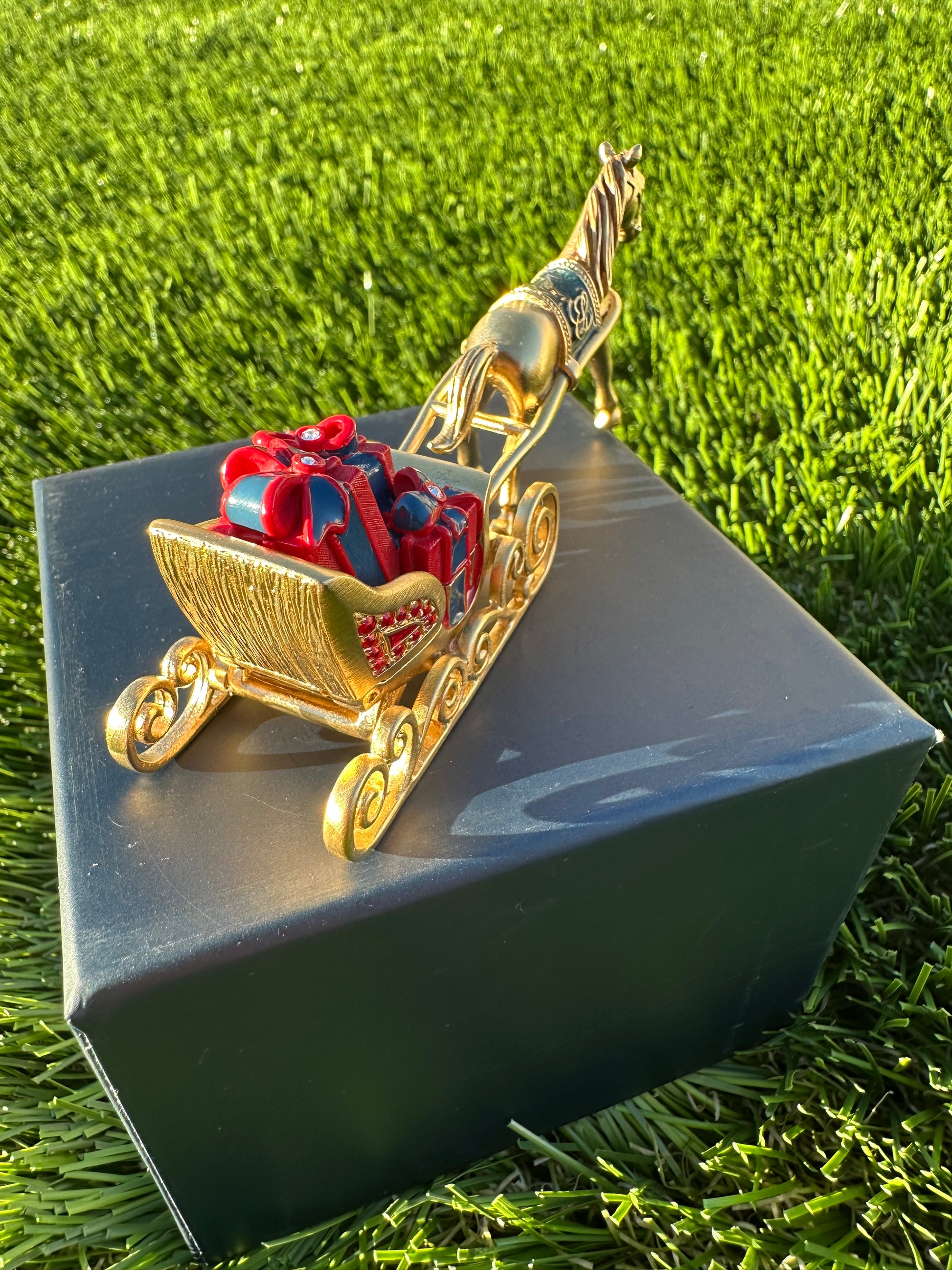 Super Rare Estée Lauder One Horse Open Sleigh solid perfume compact with the original Pleasures solid perfume still inside. A finely detailed holiday piece featuring wrapped gifts in rich reds and golds, a sculpted horse with the EL script on the saddle, and a sleigh design that feels warm, thoughtful, and special.