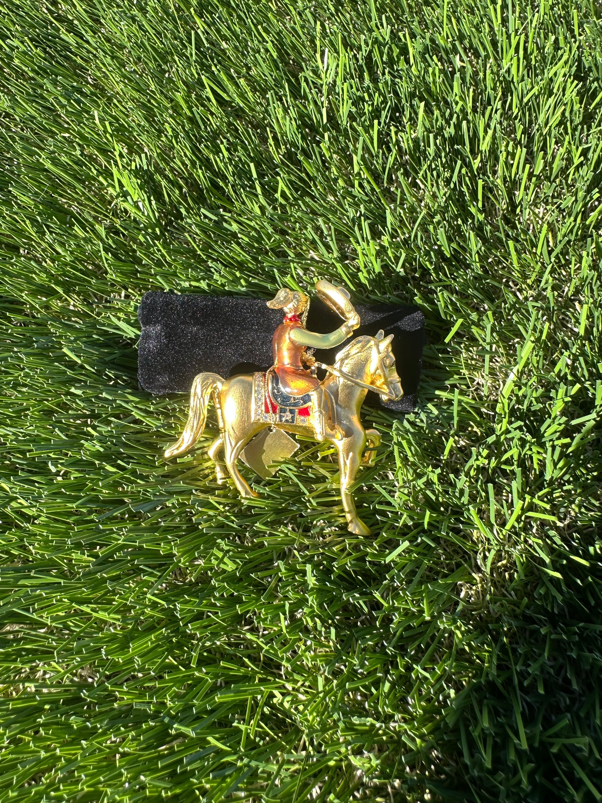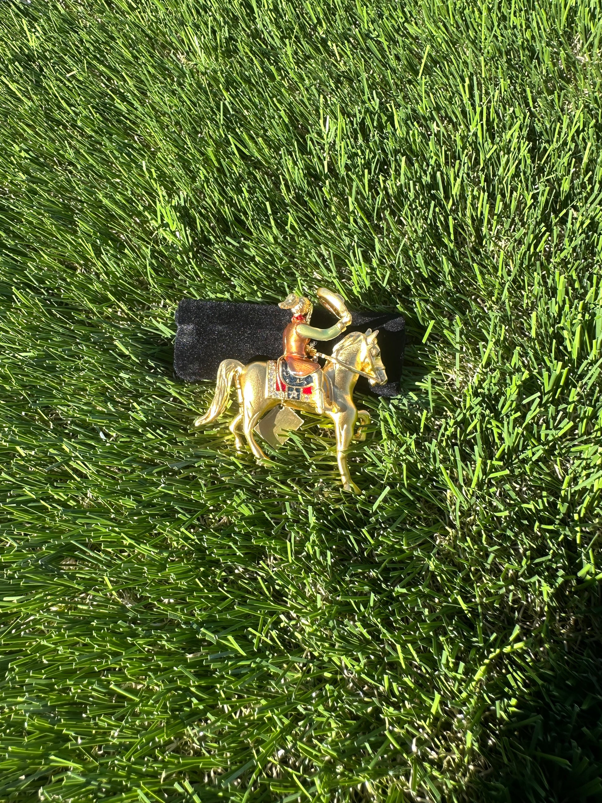 Estée Lauder solid perfume compact featuring a rodeo cowgirl design with the original solid perfume still inside. Finely detailed and full of personality, this piece leans playful and nostalgic without feeling cheesy.