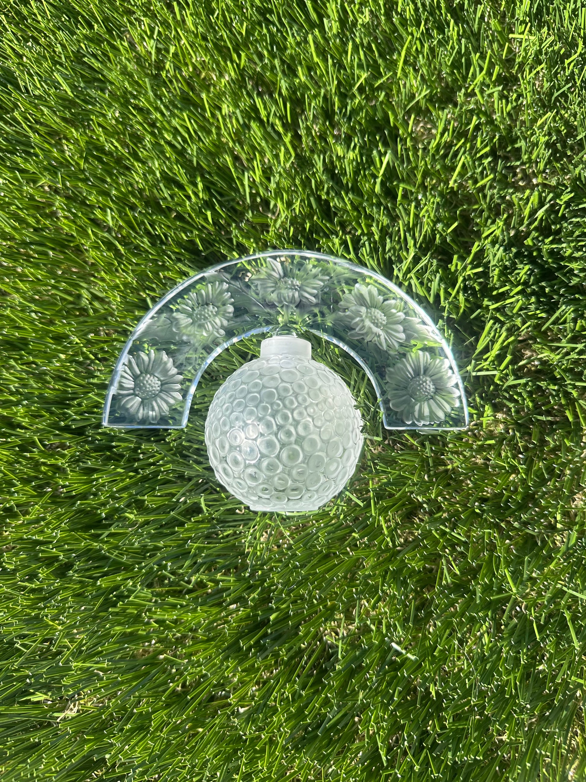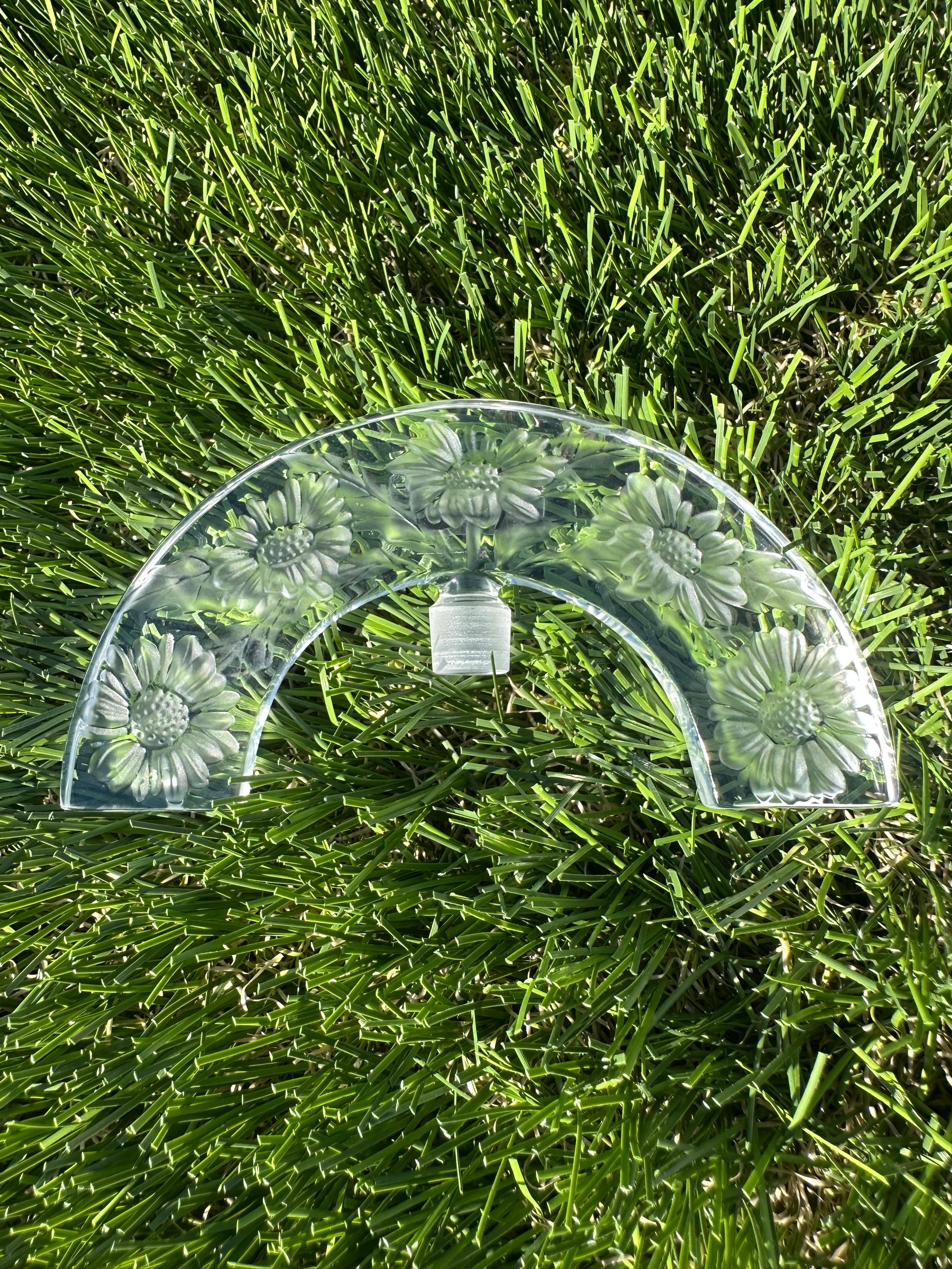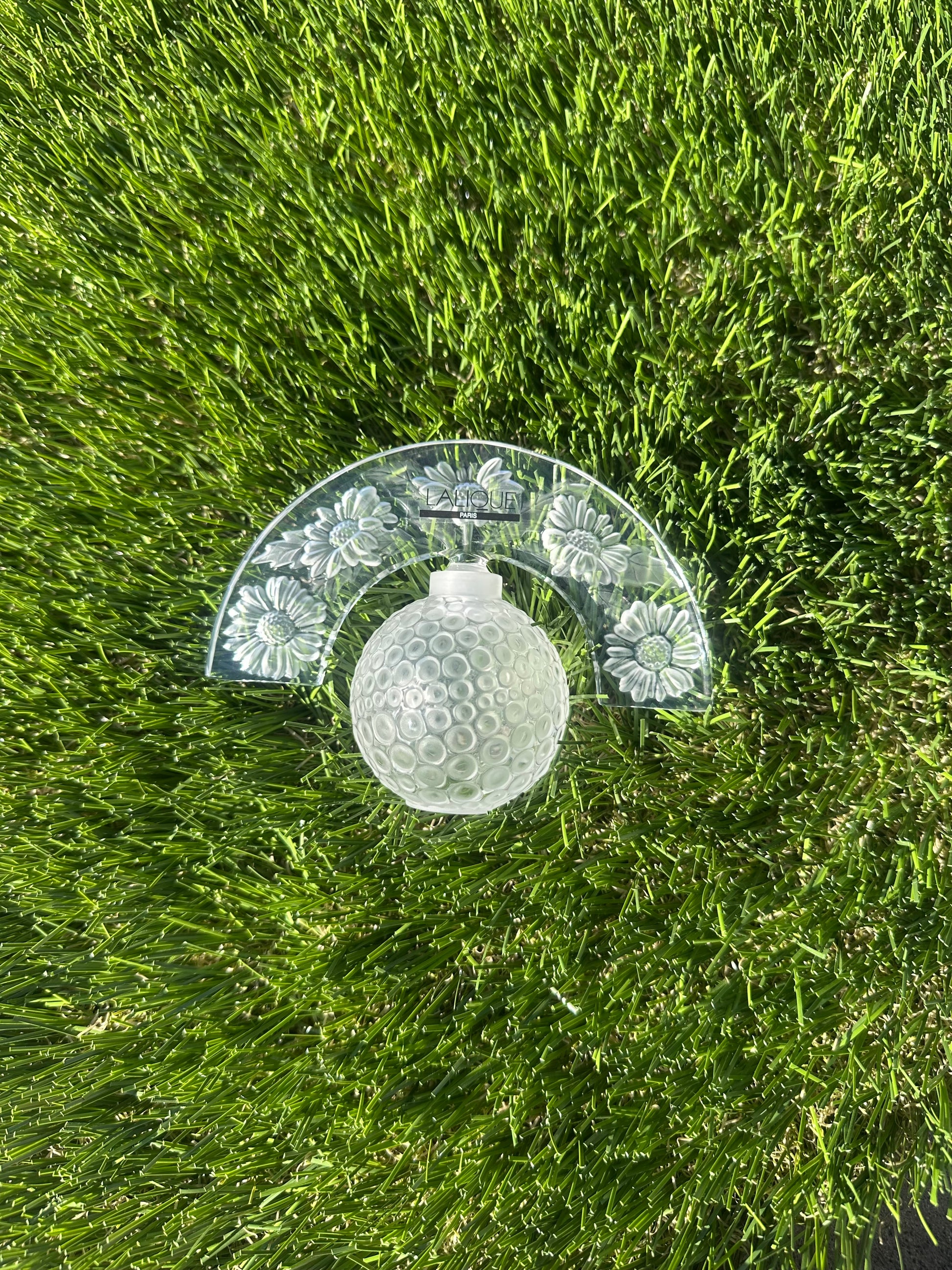 Lalique Crystal Folie perfume bottle with tiara style stopper, hand crafted in France and etched Lalique France on the base. The design features daisy forms shaping the rounded body, with satin finished floral details on the stopper. It has strong presence and beautiful proportions, the kind of piece that immediately reads high end and considered.