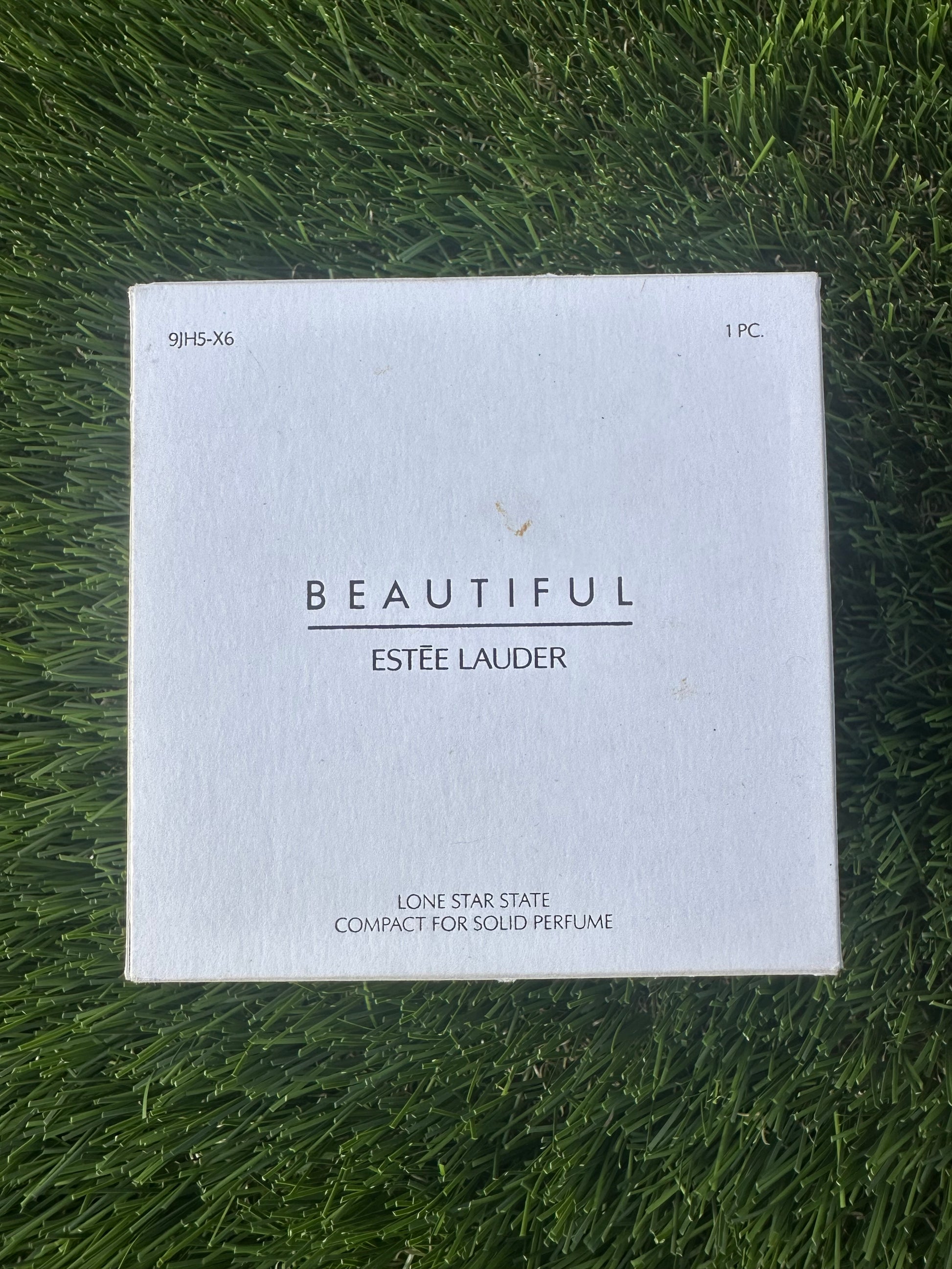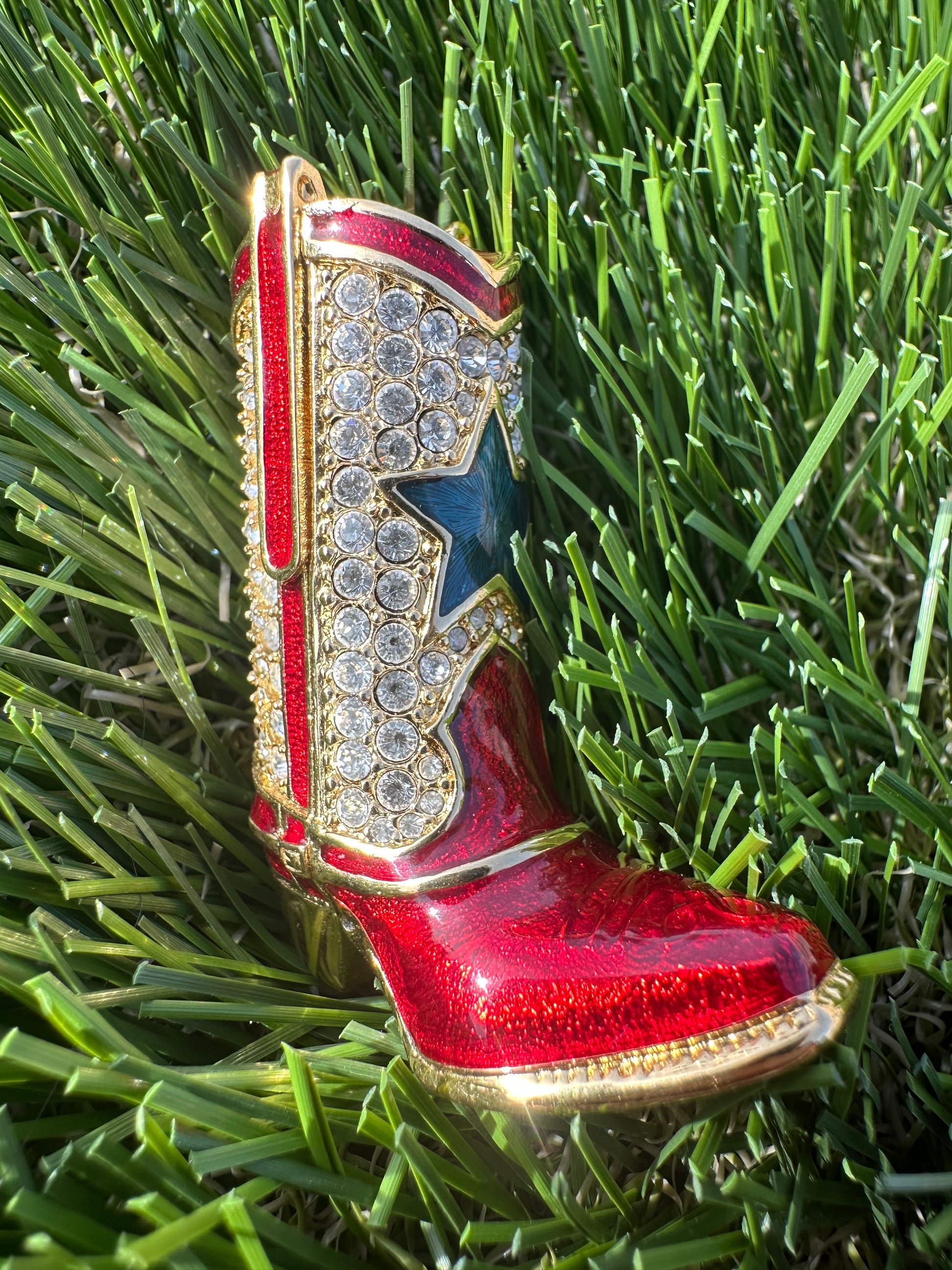Estée Lauder solid perfume compact shaped like a cowboy boot with the original perfume still inside. The spur on the back actually spins, adding a small interactive detail that makes this piece even more fun to handle and display.